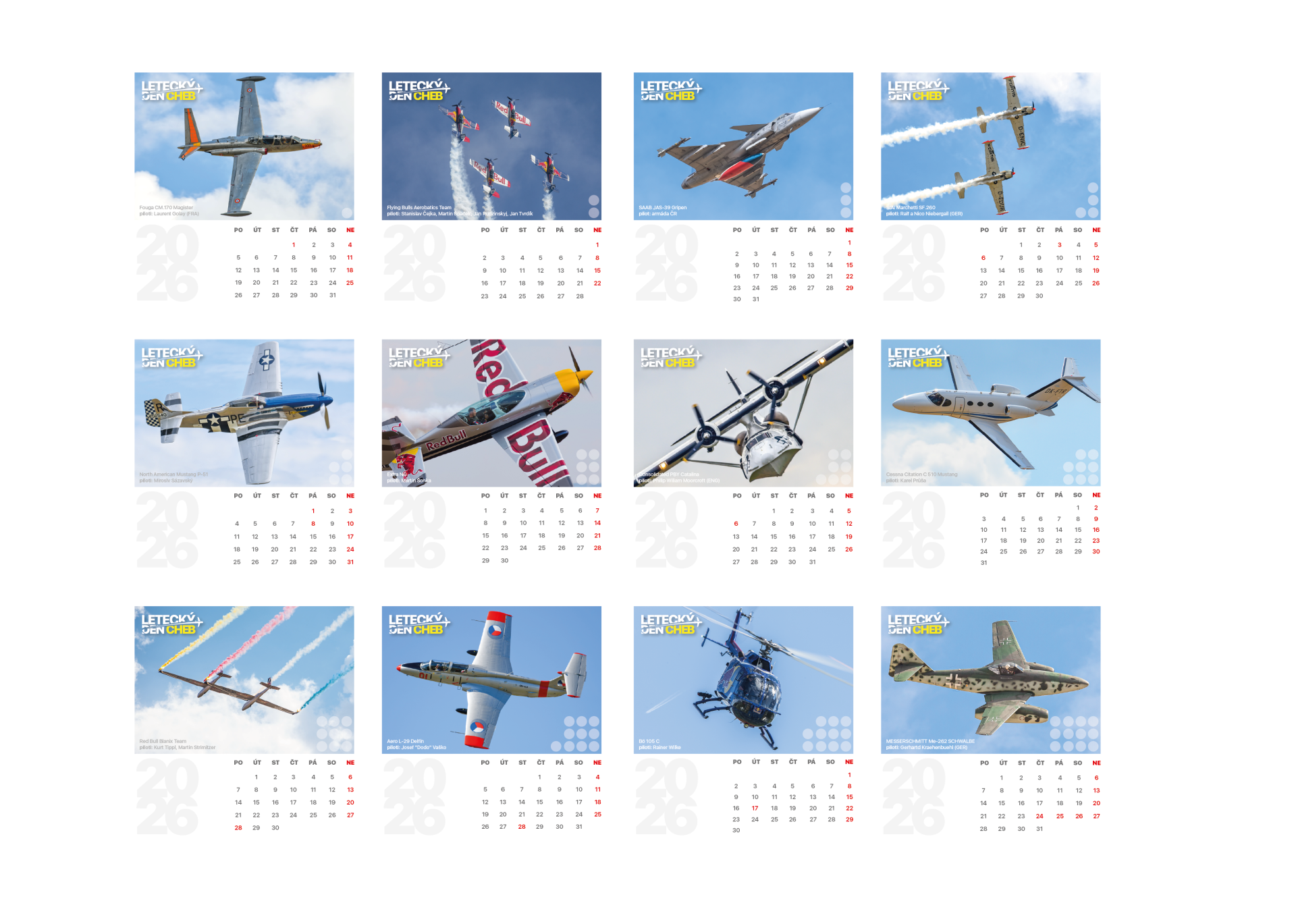 S příchodem vánočního období vám představujeme oficiální nástěnný kalendář Letecký den Cheb pro rok 2026, který vznikl z těch nejlepších okamžiků posledního ročníku. Pečlivě jsme vybrali 12 nejkrásnějších fotografií, které vám budou po celý rok připomínat nabitou atmosféru i jedinečné momenty letecké show v Chebu.